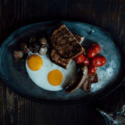Two eggs, bacon, sausage, mushrooms, tomatoes