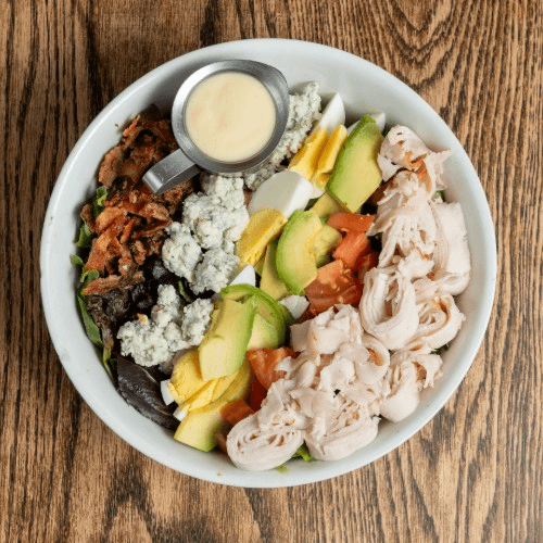 Turkey, tomatoes, avocados, blue cheese, bacon, egg, cucumber, roasted garlic dressing