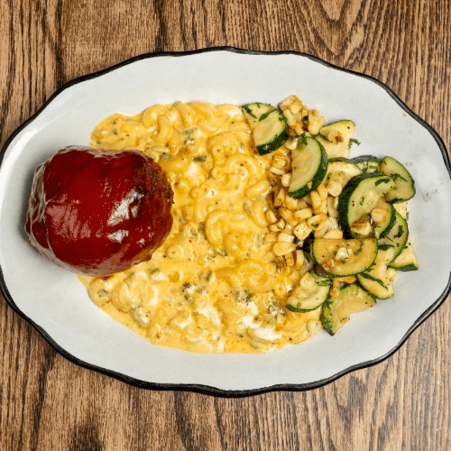 Alderwood smoked meatloaf, chipotle ketchup glaze, Texas mac and cheese