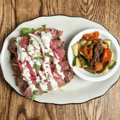 Arugula, pickled onion, blue cheese, horseradish