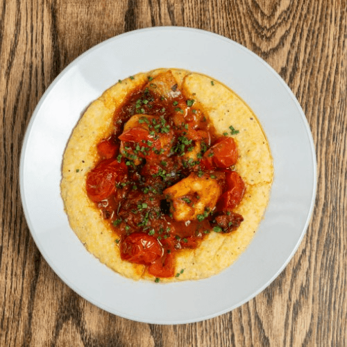 Sautéed shrimp, chorizo, peppers, onions, and tomatoes on top of our homemade cheesy grits
